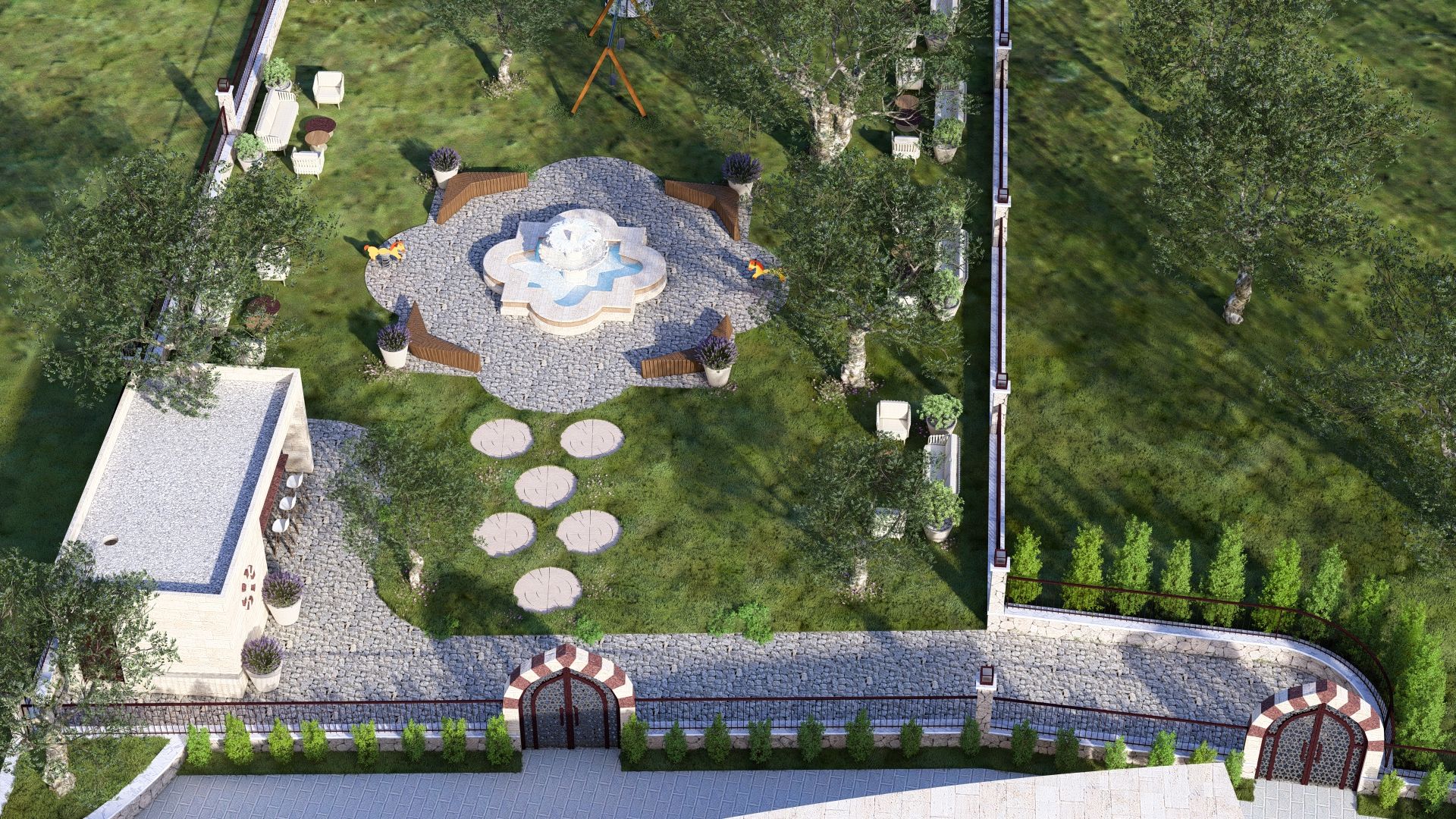 Oriental-style Courtyard with Seating and Playground