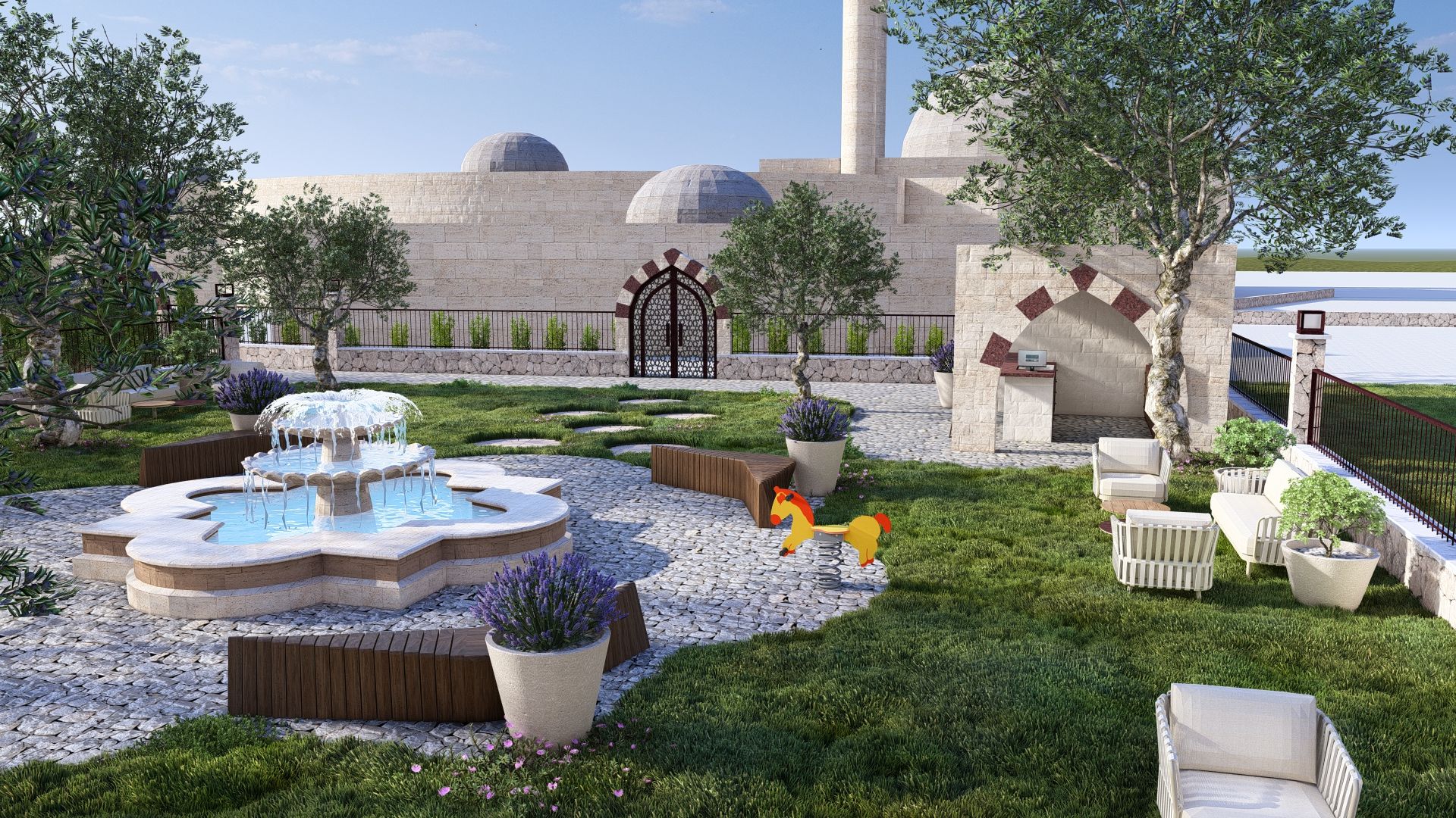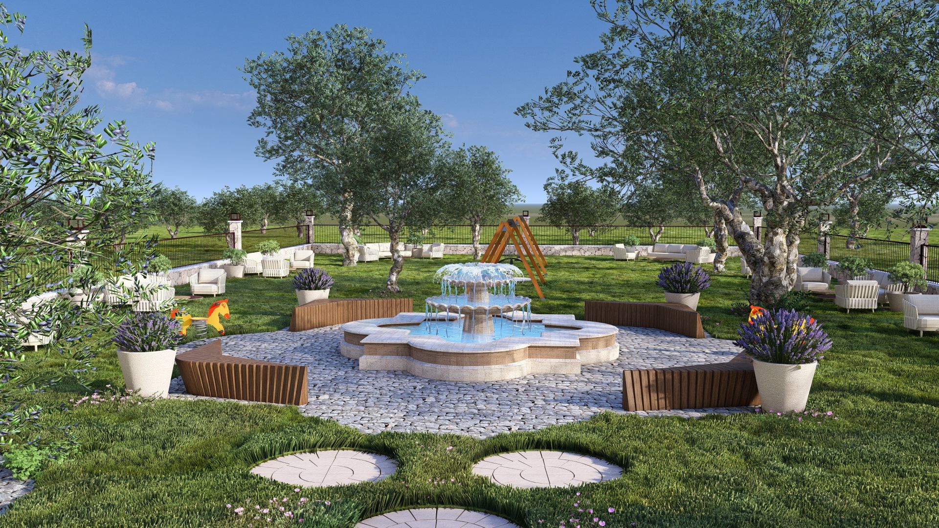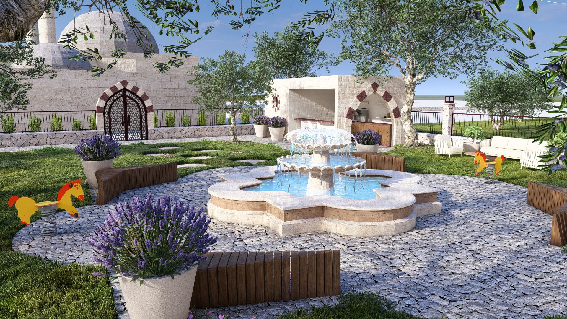 Oriental-style Courtyard with Seating and Playground